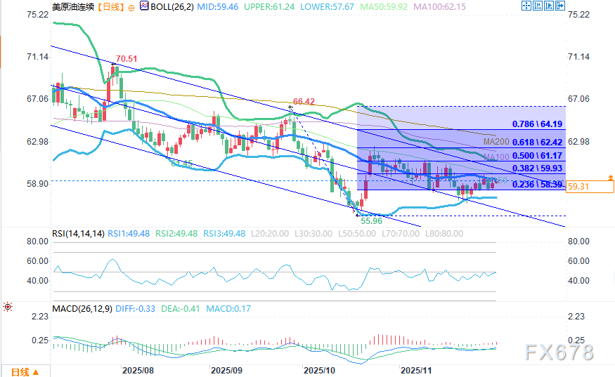若油价维持温和上行倾向,50日均线59.92美元将重新成为市场焦点。该指标自10月下旬以来多次抑制反弹,成为多头面临的首个真正考验。若能顺利突破,市场注意力将转向100日均线62.15美元。
