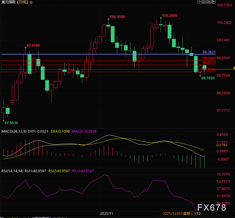 目前支撑仅有98.87,而近期关键压力位则有三条,对美元非常不利,美元指数倾向继续寻底震荡,之后慢慢构筑反弹形态。